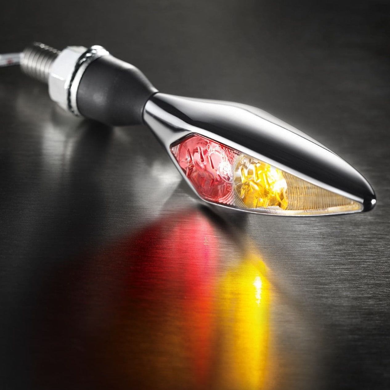 Our innovative indicator-brake-rear light combination in our distinctive micro Rhombus housing offers new styling options for the rear of your bike. The original tail light can be eliminated. Made to the highest standards of quality, the micro Rhombus DF are now available with the option of clear or dark tinted lenses. With its characteristically bright double rear lights the micro Rhombus DF are the latest trend in indicator design. Kellermann HighPower LED Technology** coupled with its compact housing translates to an extremely lightweight unit. Suitable for all motorcycle models*.